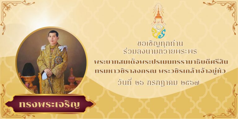 ขอเชิญลงทะเบียนเข้าร่วมพิธีถวายพระพรชัยมงคลและพิธีเจริญพระพุทธมนต์เฉลิมพระเกียรติ พระบาทสมเด็จพระเจ้าอยู่หัว และเข้าร่วมกิจกรรมจิตอาสาเฉลิมพระเกียรติ เนื่องในวันเฉลิมพระชนมพรรษา ประจำปี พ.ศ.๒๕๖๗