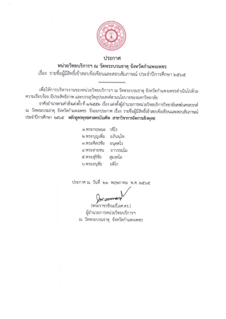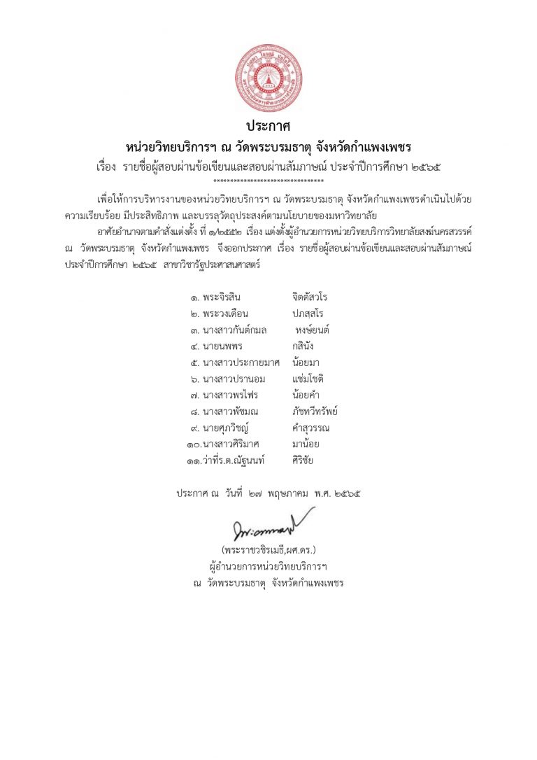 รายชื่อผู้มีสิทธิ์เข้าสอบข้อเขียนและสอบสัมภาษณ์นิสิตใหม่ ปีการศึกษา 2565