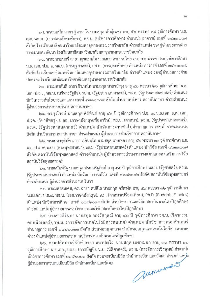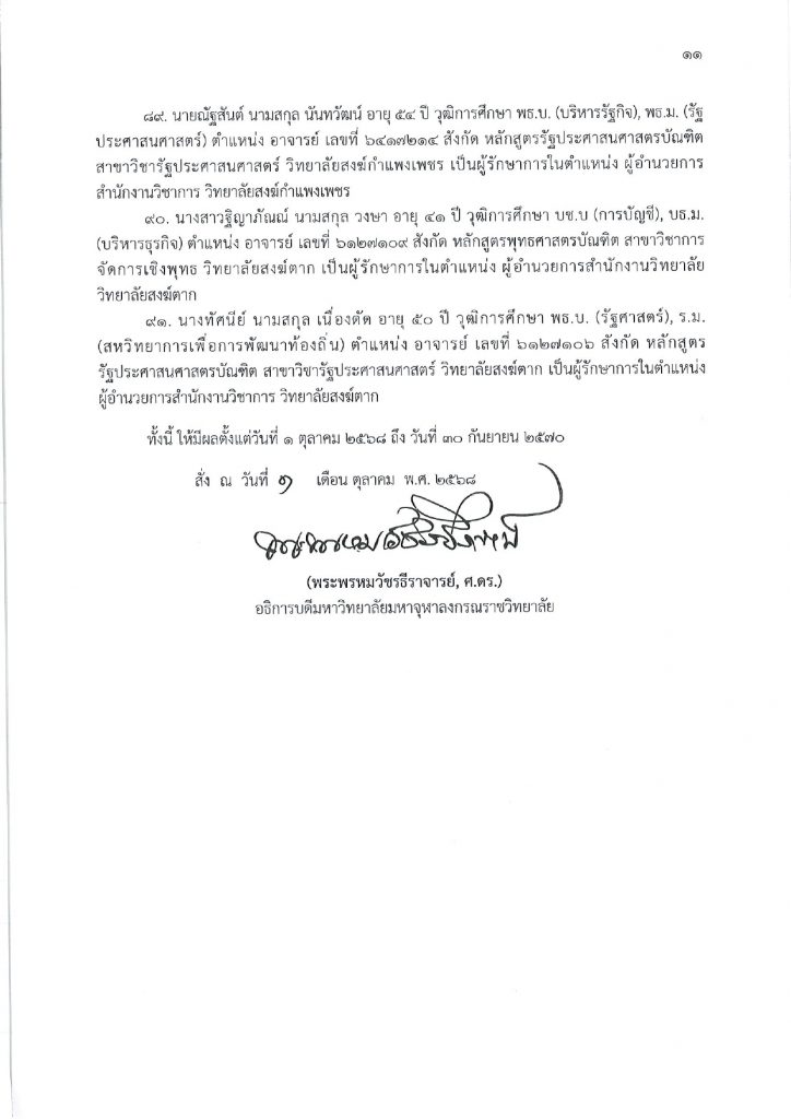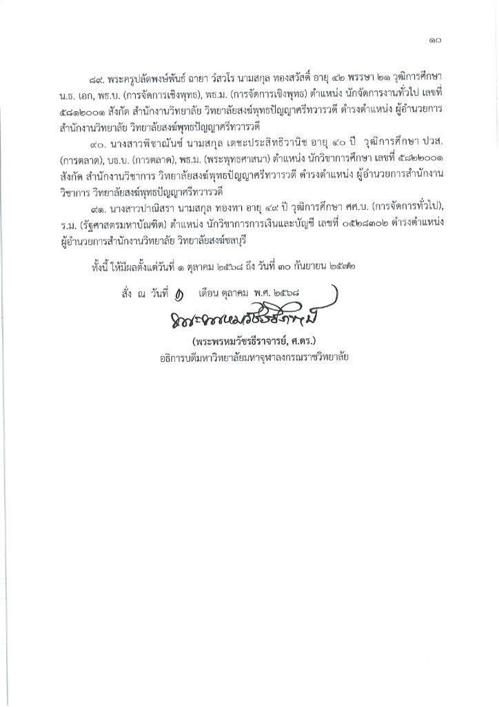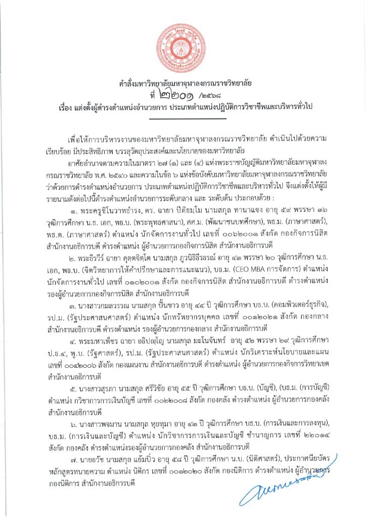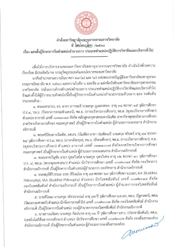 คำสั่งมหาวิทยาลัยมหาจุฬาลงกรณราชวิทยาลัย ข่าวมหาวิทยาลัย ข่าวรับสมัคร ข่าวใหม่ 04 ต.ค. 2025 21 share tweet share ที่ ๒๒๐๑ /๒๕๖๘ เรื่อง แต่งตั้งผู้ดำรงตำแหน่งอำนวยการประเภทตำแหน่งปฏิบัติการวิชาชีพและบริหารทั่วไป